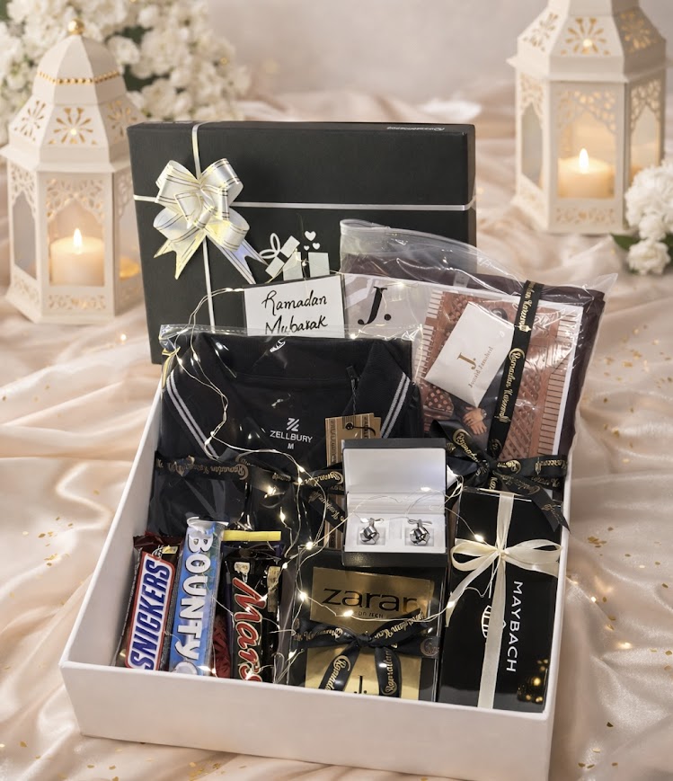 Presenting a premium men’s Eid hamper designed for the modern gentleman who appreciates quality, elegance, and thoughtful gifting. This luxury gift box brings together fashion, fragrance, accessories, and sweet treats in one impressive presentation, making it an exceptional Eidi for someone special.