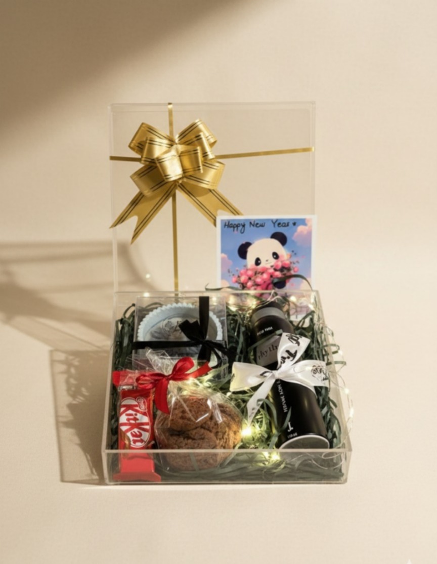Step into the New Year with style, warmth, and a little magic. New Year Magic (MEN) is thoughtfully curated to make his celebration extra special, combining a fresh fragrance, cozy essentials, and sweet treats, all beautifully arranged in a transparent acrylic box with soft fairy lights.