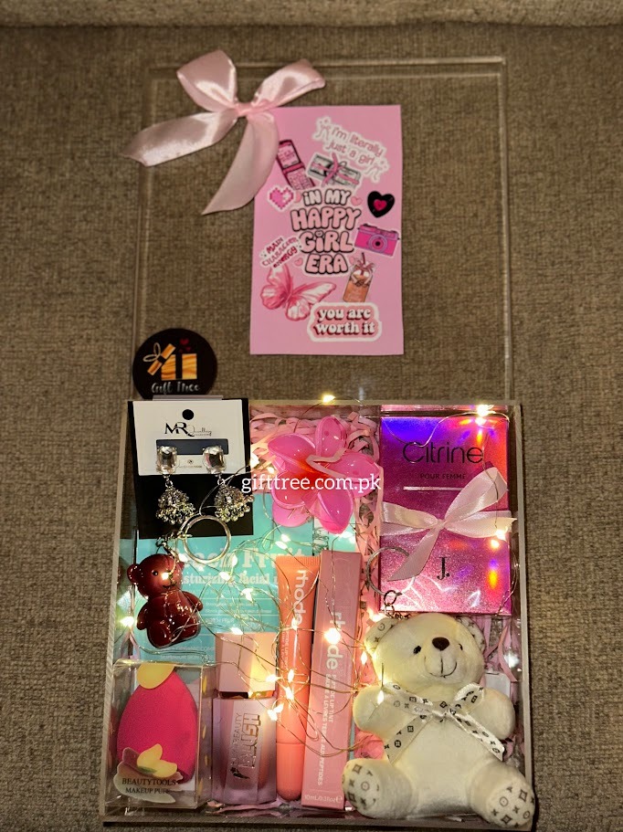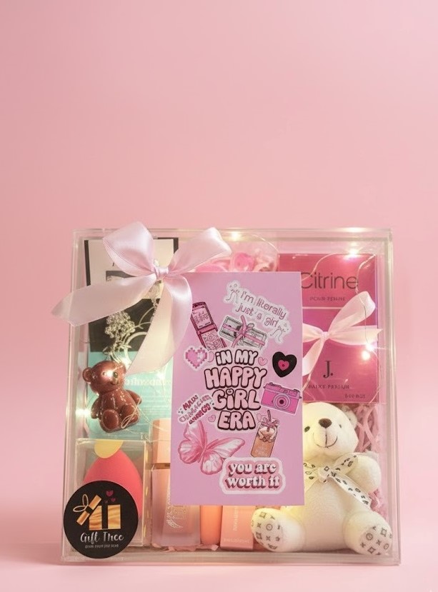 Packaged in a clear acrylic gift box with a pink ribbon and aesthetic finishing, the Soft Girl Glow Hamper is perfect for birthdays, anniversaries, best-friend gifting, proposals and surprise celebrations.